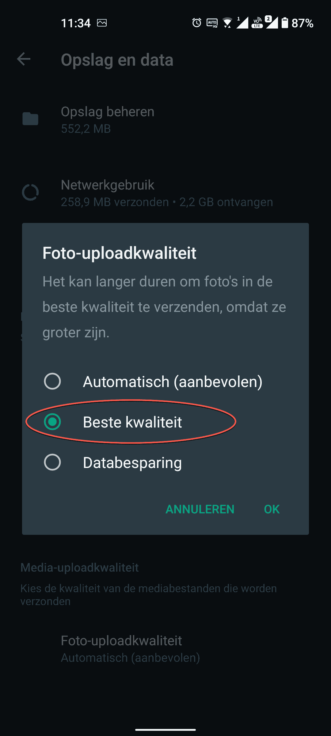 Stuur de foto’s het liefst in via de mail, maar als het moet via Whatsapp, zorg dat de instellingen staan zoals hieronder: ga eerst naar de instellingen van Whatsapp rechtsboven:
